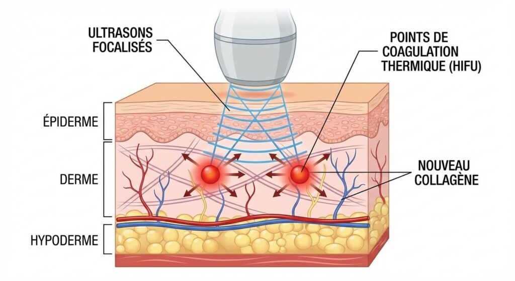 Pour ne pas s’alarmer face au miroir, il faut comprendre le mode d’action de la machine. La technologie HIFU ne chauffe pas la surface de la peau (l’épiderme reste intact, d’où l’absence de croûtes ou de brûlures). Elle délivre des ultrasons focalisés qui traversent les tissus pour aller créer de minuscules points de coagulation thermique très profondément, jusqu’au niveau du SMAS (le système musculo-aponévrotique superficiel qui soutient les muscles du visage).